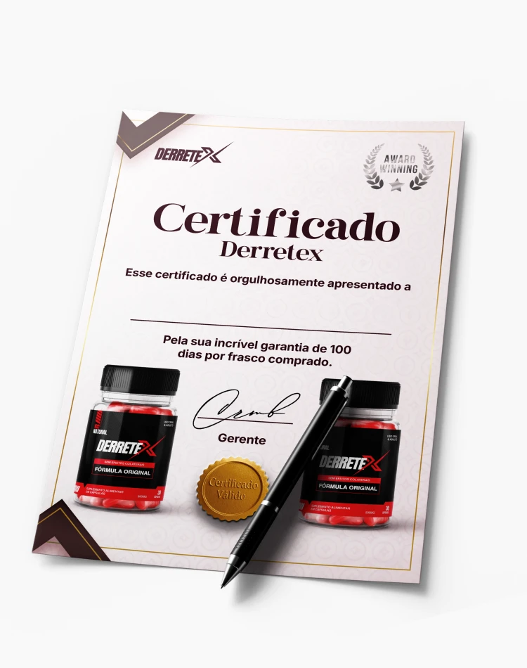 Os resultados do Derretex são tão infalíveis que damos um certificado assinado pelos nossos especialistas de até 100 dias de garantia para todos que adquirem 3 ou mais potes. Damos esse certificado de garantia porque sabemos da eficácia que o Derretex tem. Além disso, sabemos que existem muitos produtos fraudulentos por aí e, por conta disso, é normal ficar com o pé atrás. Então, você vai ter, basicamente, 100 dias para testar e comprovar os resultados do Derretex.